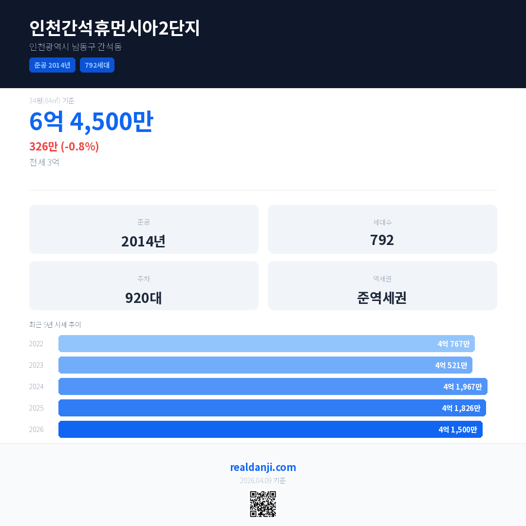 인천간석휴먼시아2단지 최근 거래가는 6억 4,500만입니다. (2026-03)