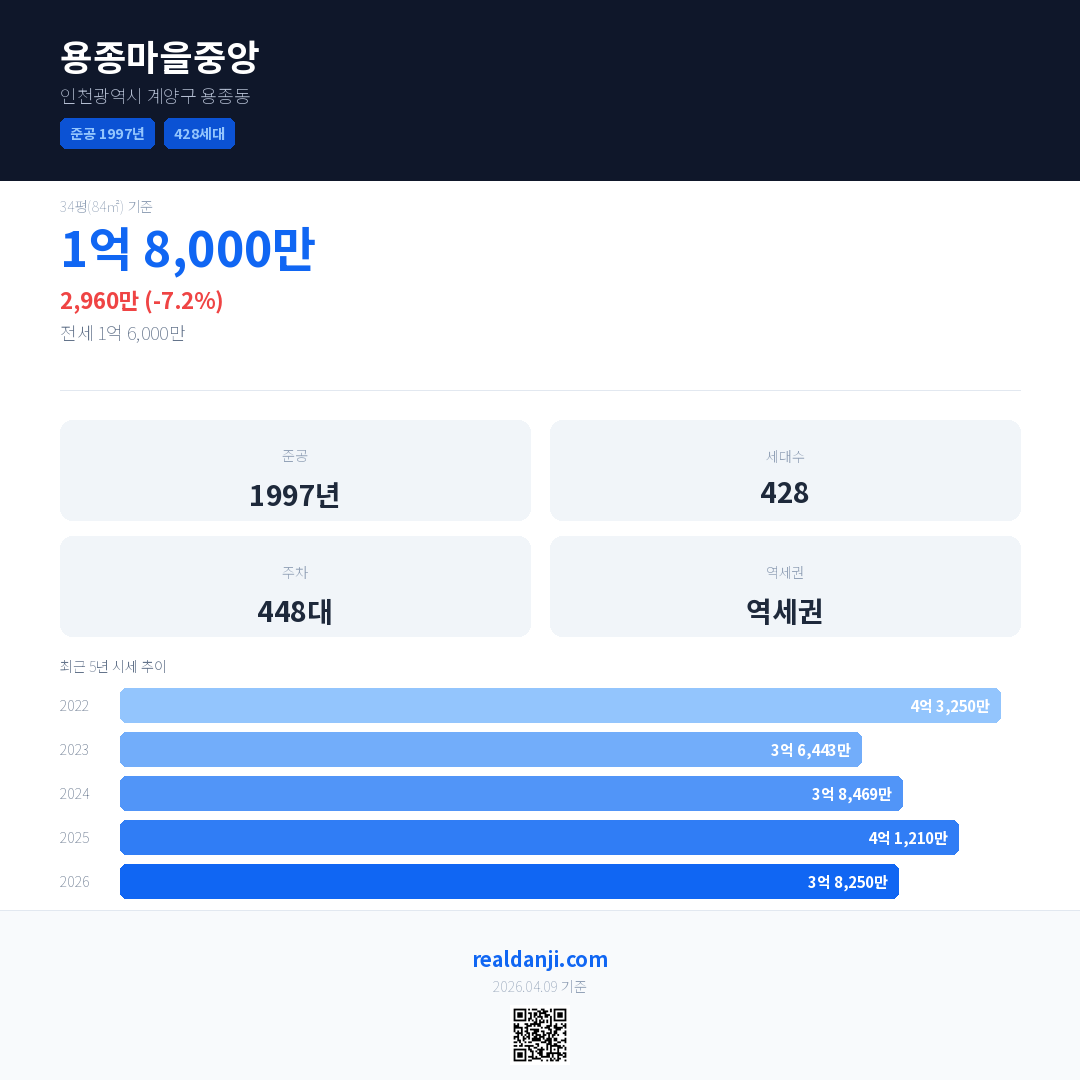 용종마을중앙 국민평형 기준 2026년 평균 거래가는 3억 8,250만으로, 전년 대비 7.2% 하락 했습니다.