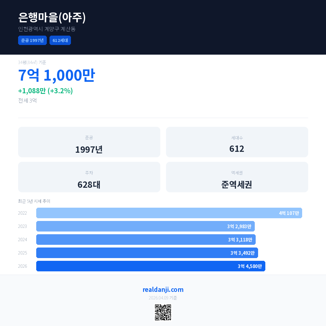 은행마을(아주) 국민평형 기준 2026년 평균 거래가는 3억 4,580만으로, 전년 대비 3.2% 상승 했습니다.