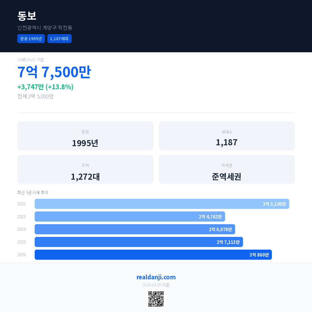 동보 국민평형 기준 2026년 평균 거래가는 3억 860만으로, 전년 대비 13.8% 상승 했습니다.