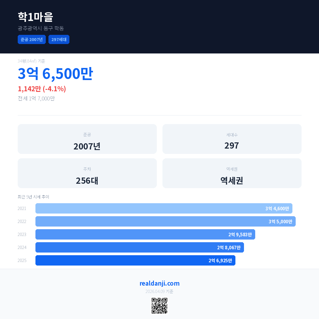 학1마을 국민평형 기준 2025년 평균 거래가는 2억 6,925만으로, 전년 대비 4.1% 하락 했습니다.