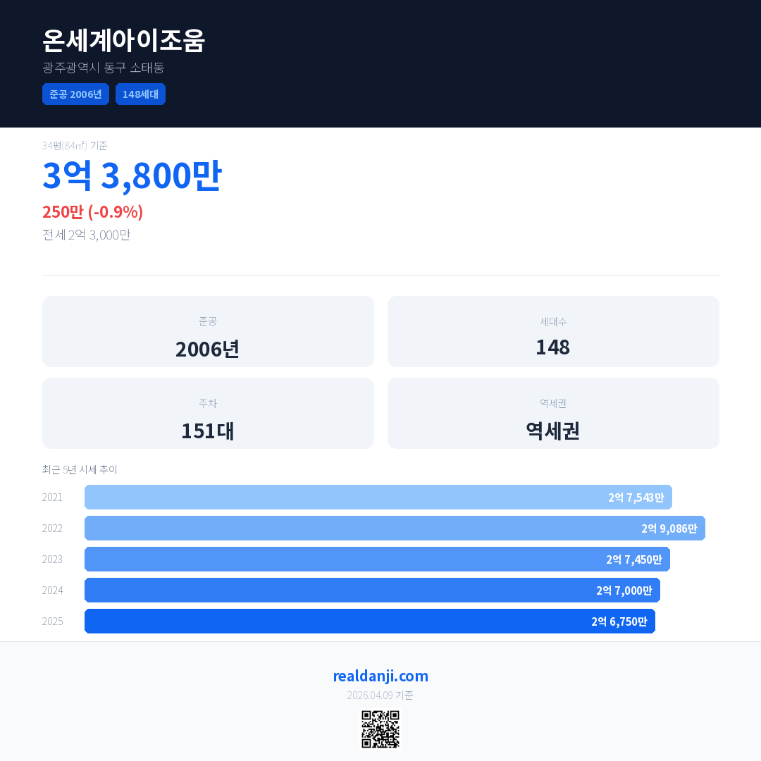 온세계아이조움 국민평형 기준 2025년 평균 거래가는 2억 6,750만으로, 전년 대비 0.9% 하락 했습니다.