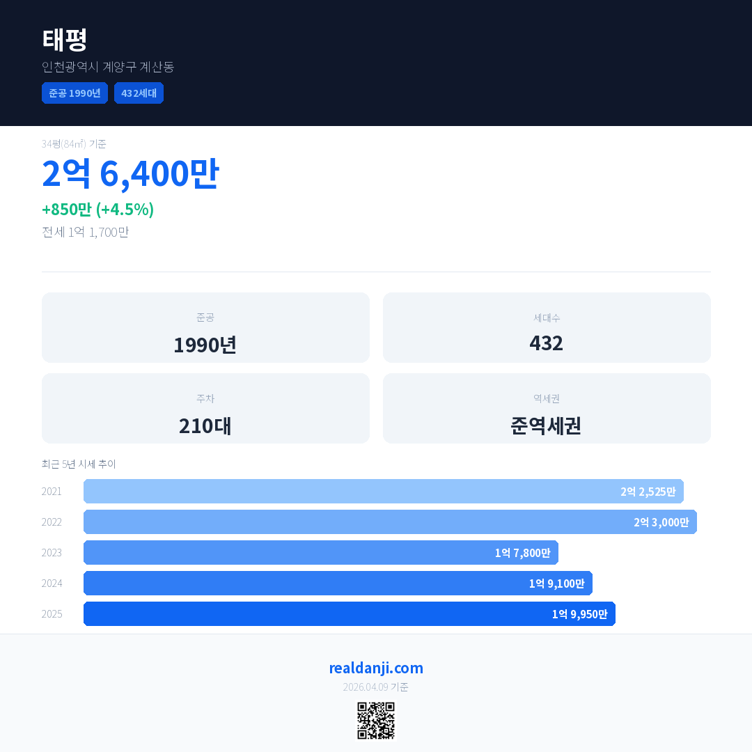 태평 국민평형 기준 2025년 평균 거래가는 1억 9,950만으로, 전년 대비 4.5% 상승 했습니다.