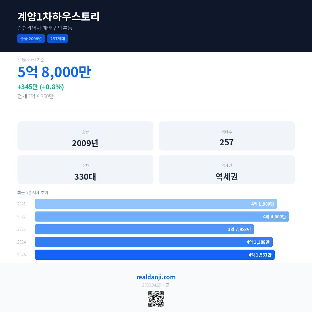 계양1차하우스토리 국민평형 기준 2025년 평균 거래가는 4억 1,533만으로, 전년 대비 0.8% 상승 했습니다.