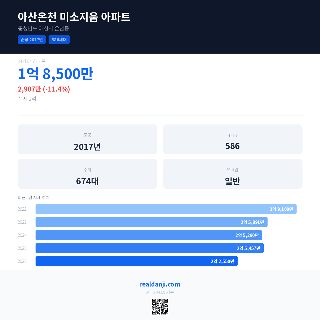 아산온천 미소지움 아파트 국민평형 기준 2026년 평균 거래가는 2억 2,550만으로, 전년 대비 11.4% 하락 했습니다.