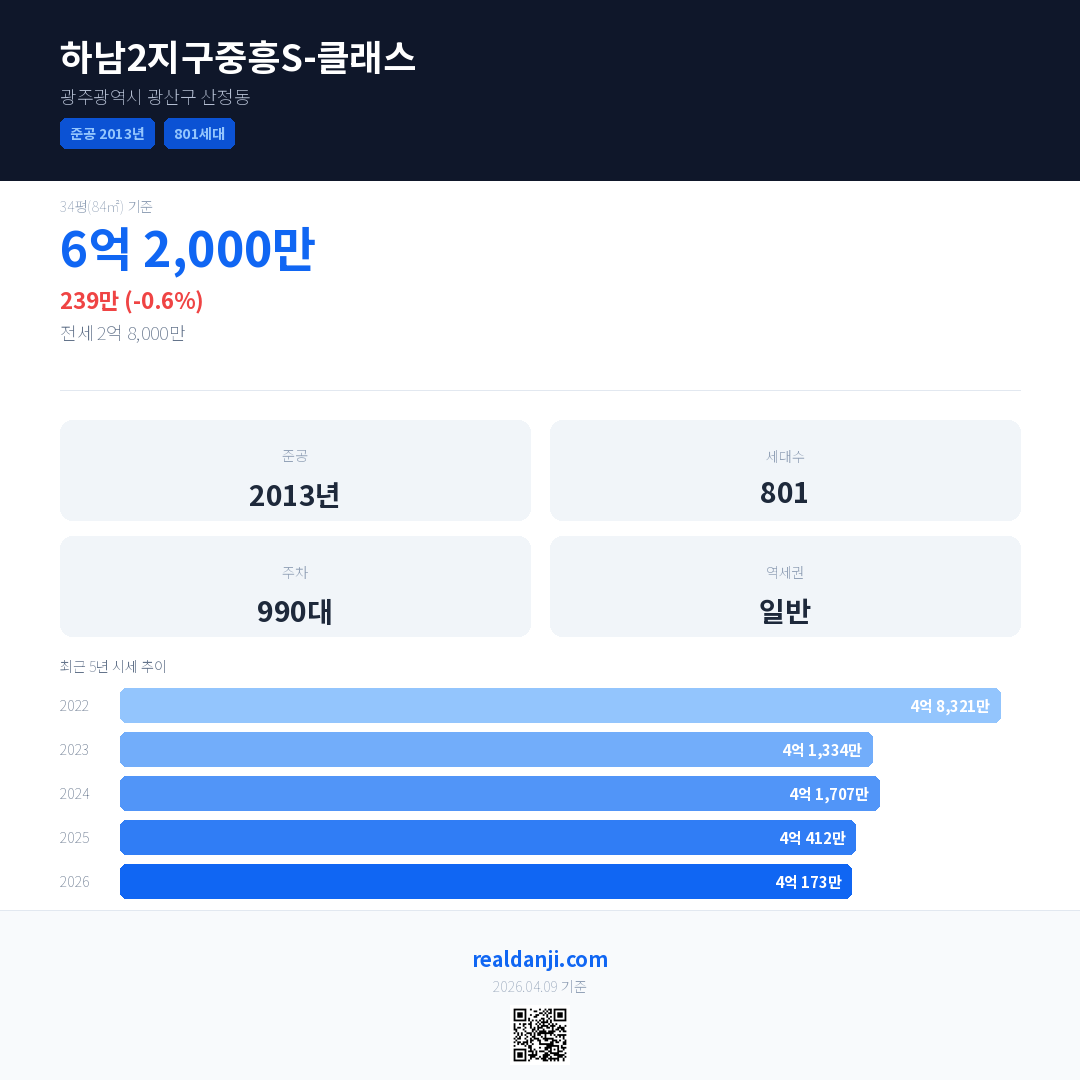 하남2지구중흥S-클래스 국민평형 기준 2026년 평균 거래가는 4억 173만으로, 전년 대비 0.6% 하락 했습니다.