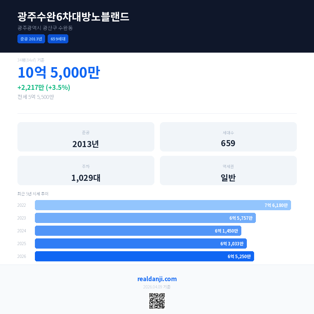 광주수완6차대방노블랜드 국민평형 기준 2026년 평균 거래가는 6억 5,250만으로, 전년 대비 3.5% 상승 했습니다.