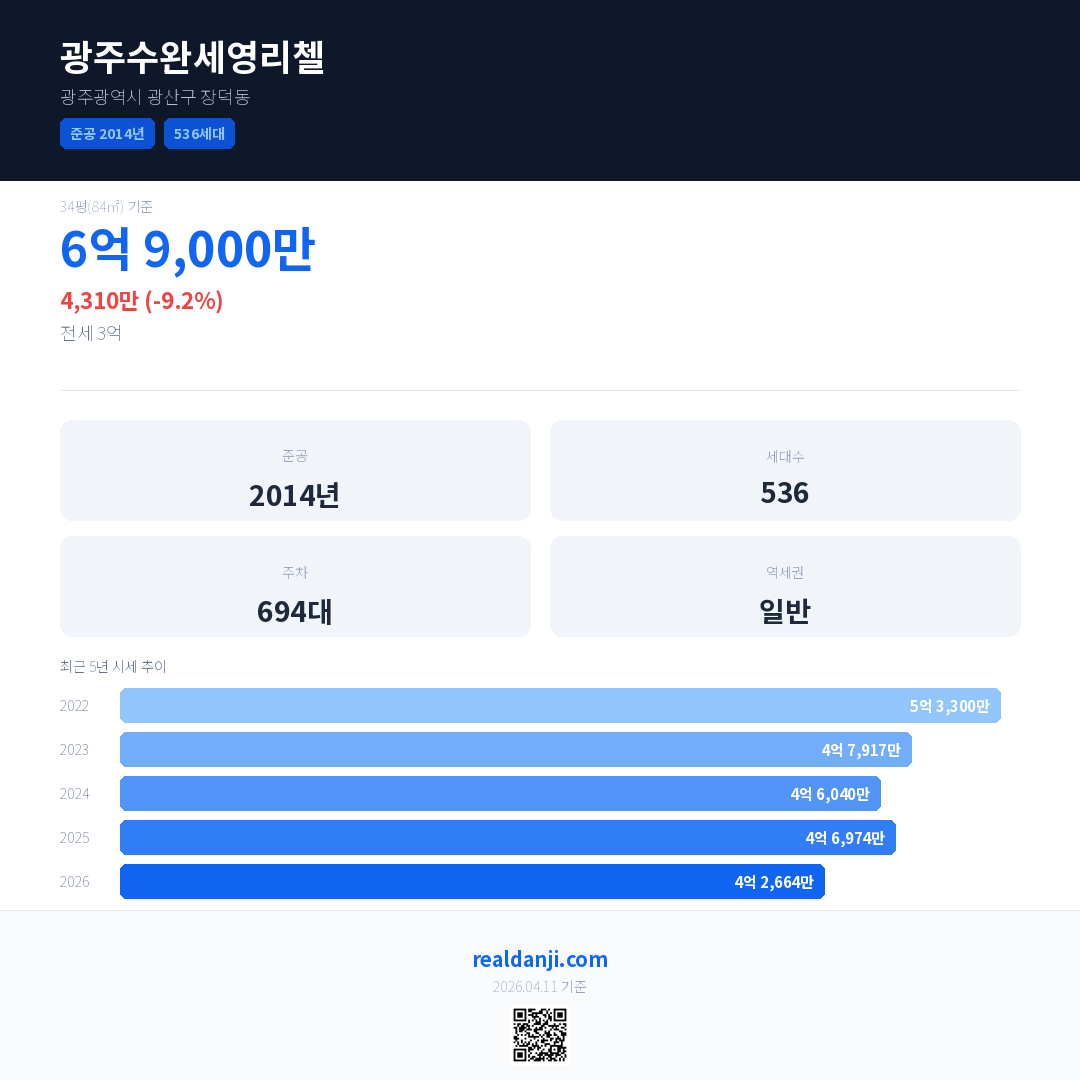 광주수완세영리첼 최근 거래가는 6억 9,000만입니다. (2026-04)