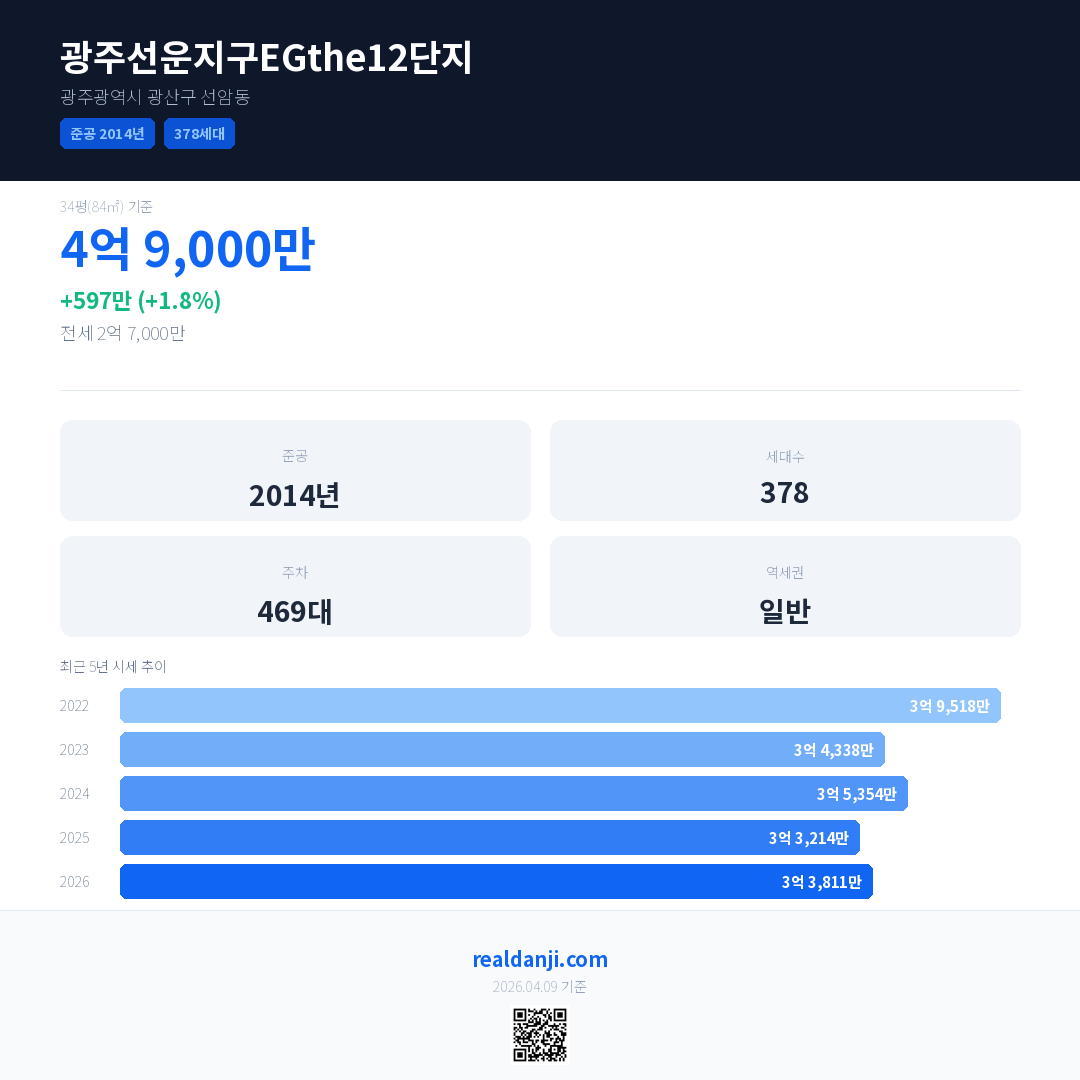 광주선운지구EGthe12단지은(는) 2014년에 준공되었으며, 현재 12년차입니다. 총 378세대 규모입니다.