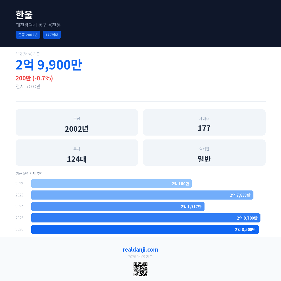 한울 국민평형 기준 2026년 평균 거래가는 2억 8,500만으로, 전년 대비 0.7% 하락 했습니다.