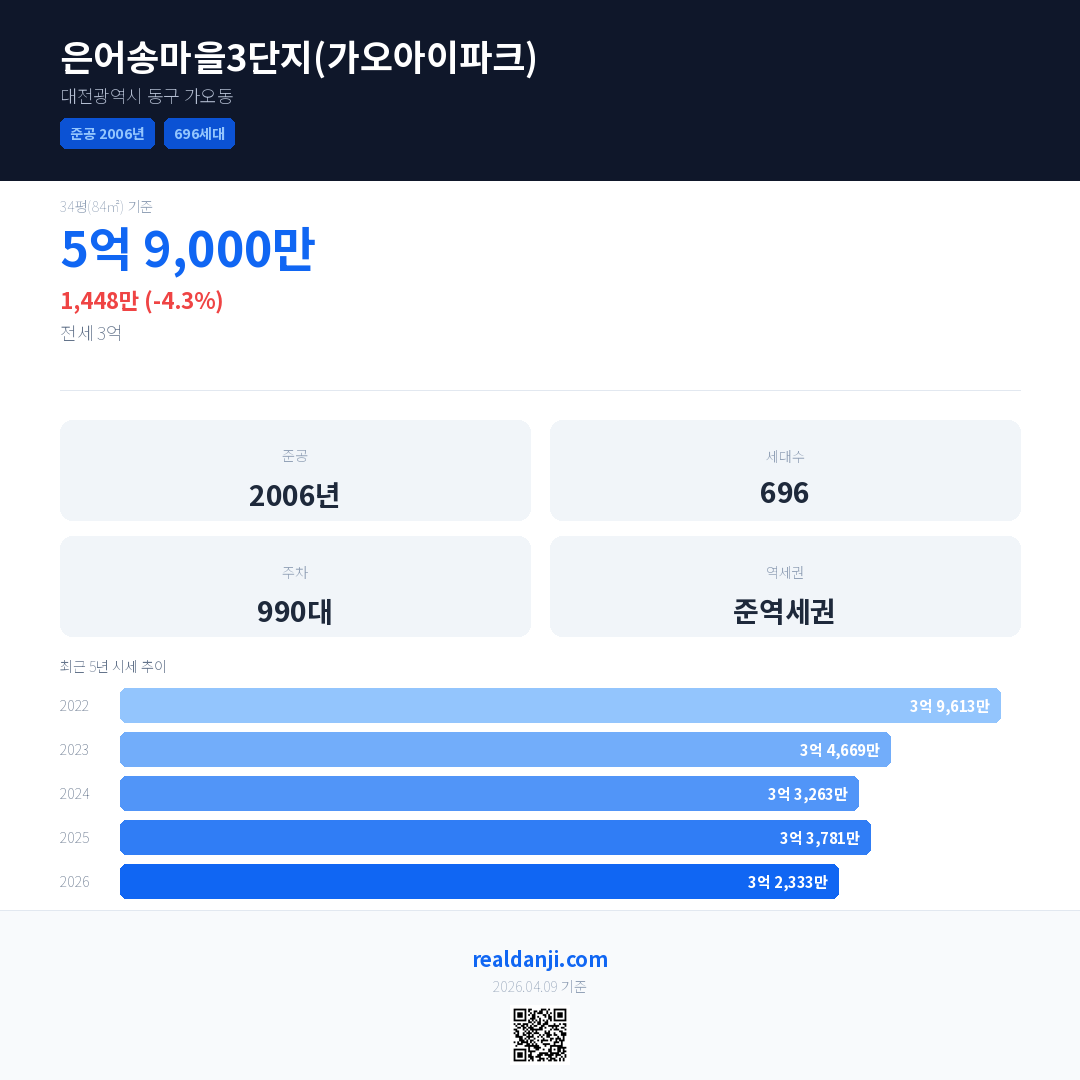 은어송마을3단지(가오아이파크) 최근 거래가는 5억 9,000만입니다. (2026-04)
