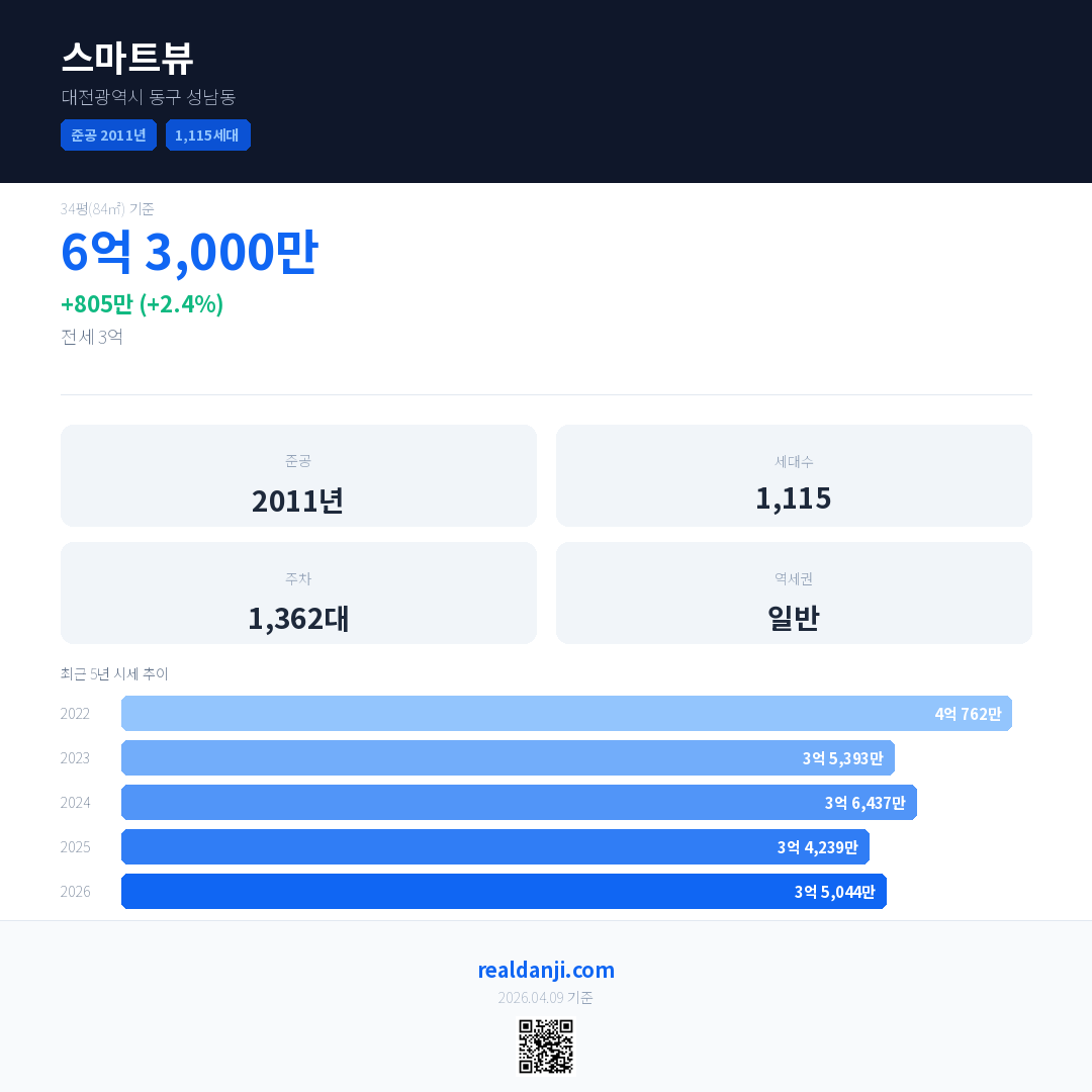 스마트뷰 국민평형 기준 2026년 평균 거래가는 3억 5,044만으로, 전년 대비 2.4% 상승 했습니다.