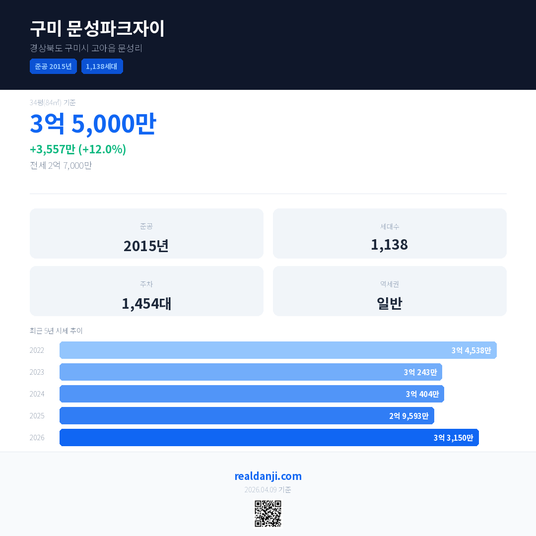 구미 문성파크자이 국민평형 기준 2026년 평균 거래가는 3억 3,150만으로, 전년 대비 12.0% 상승 했습니다.