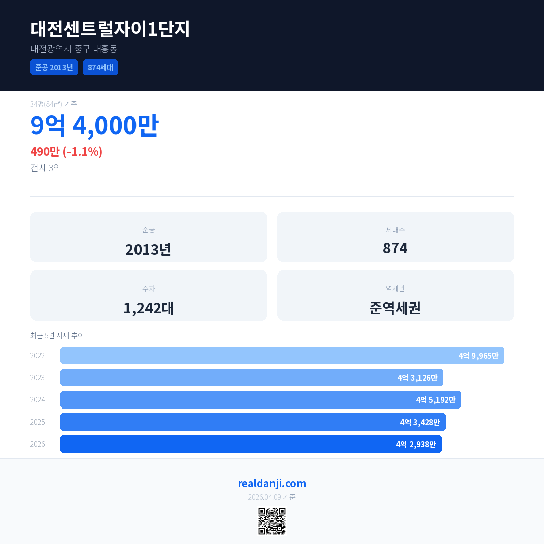 대전센트럴자이1단지 최근 거래가는 9억 4,000만입니다. (2026-03)