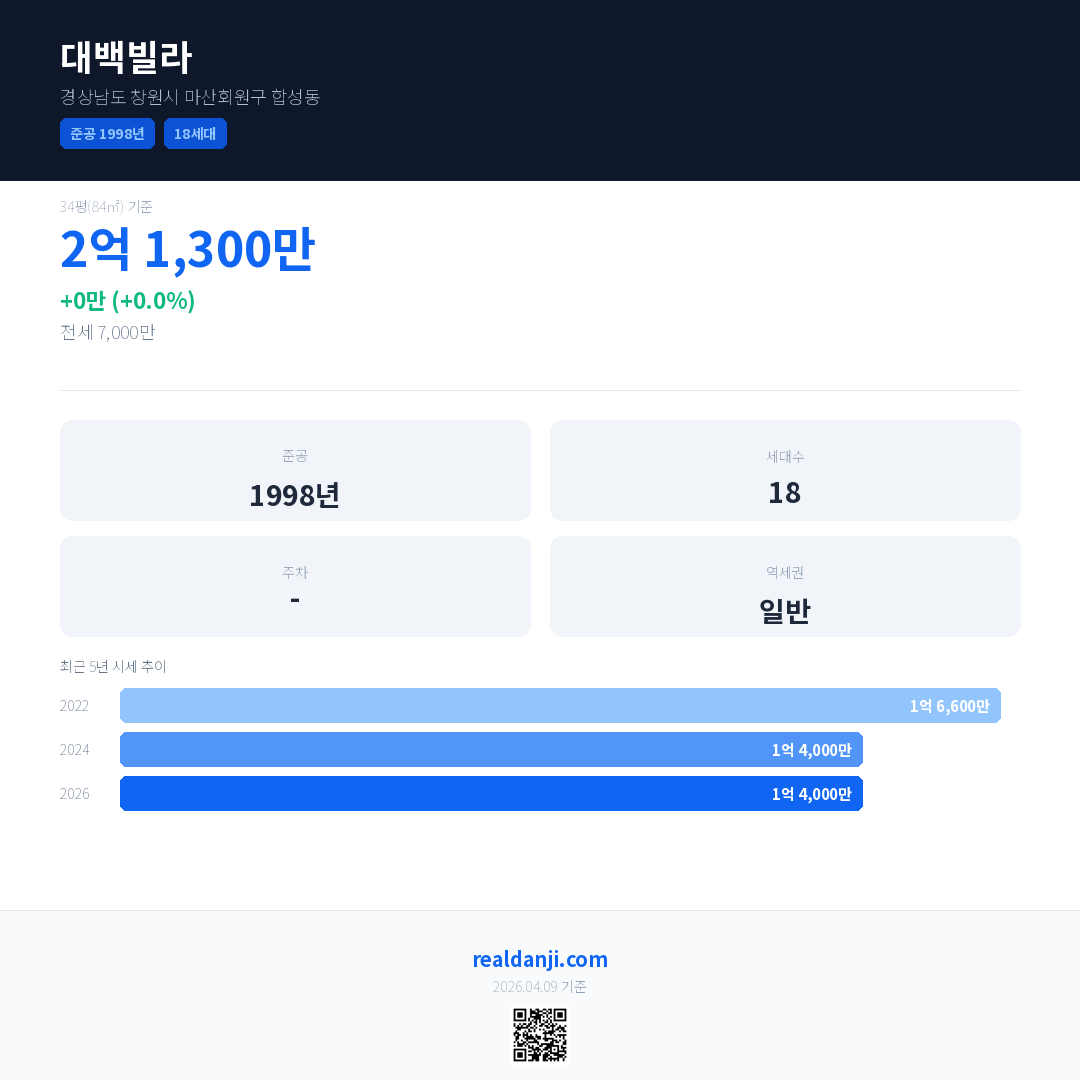 대백빌라 국민평형 기준 2026년 평균 거래가는 1억 4,000만으로, 전년 대비 0.0% 하락 했습니다.