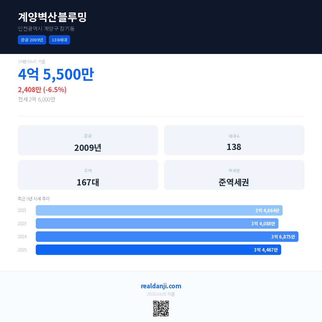 계양벽산블루밍은(는) 2009년에 준공되었으며, 현재 17년차입니다. 총 138세대 규모입니다.