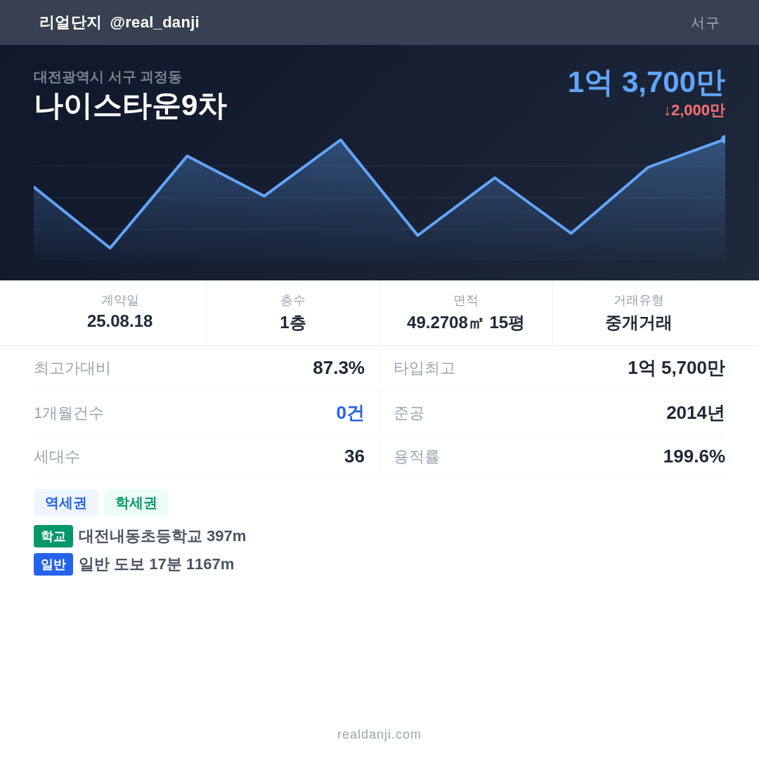 나이스타운9차 최근 거래가는 1억 5,700만입니다. (2025-08)