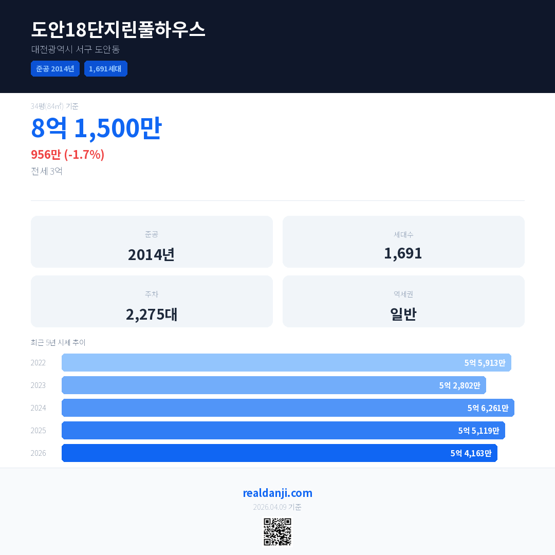도안18단지린풀하우스 국민평형 기준 2026년 평균 거래가는 5억 4,163만으로, 전년 대비 1.7% 하락 했습니다.