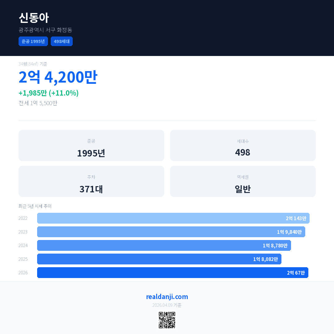 신동아 국민평형 기준 2026년 평균 거래가는 2억 67만으로, 전년 대비 11.0% 상승 했습니다.