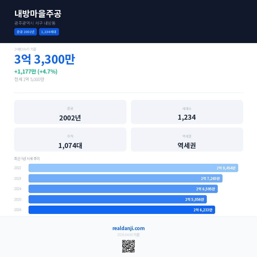 내방마을주공 국민평형 기준 2026년 평균 거래가는 2억 6,233만으로, 전년 대비 4.7% 상승 했습니다.