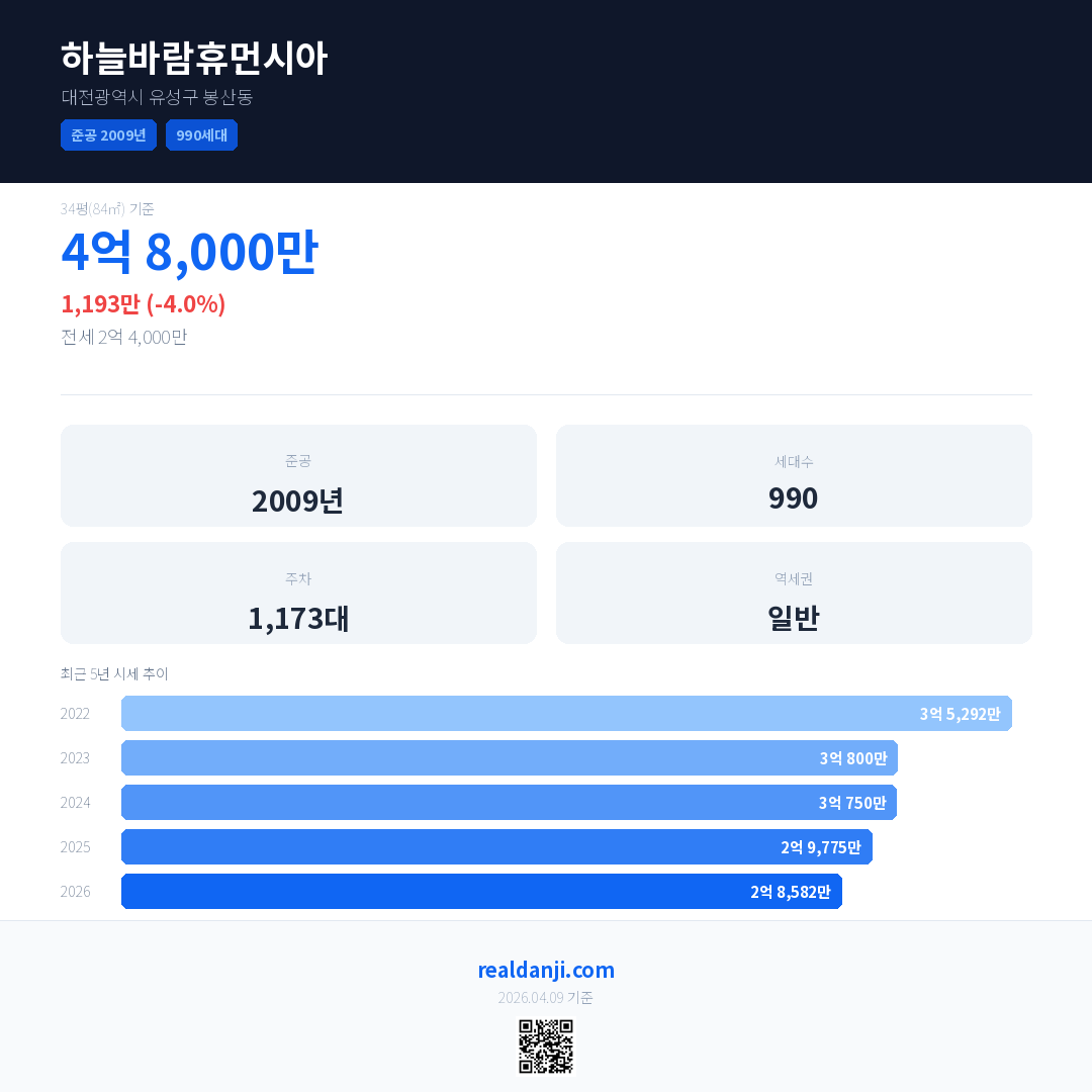 하늘바람휴먼시아 국민평형 기준 2026년 평균 거래가는 2억 8,582만으로, 전년 대비 4.0% 하락 했습니다.