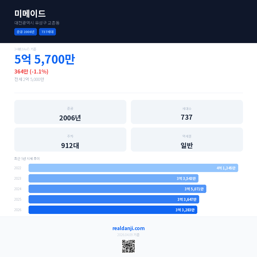 미메이드은(는) 2006년에 준공되었으며, 현재 20년차입니다. 총 737세대 규모입니다.
