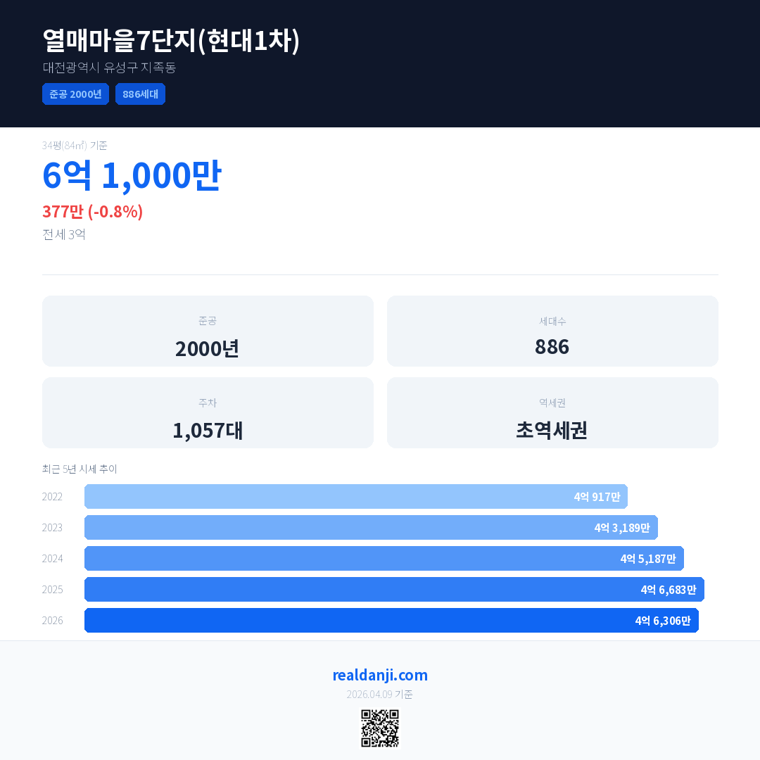 열매마을7단지(현대1차) 최근 거래가는 6억 1,000만입니다. (2026-04)