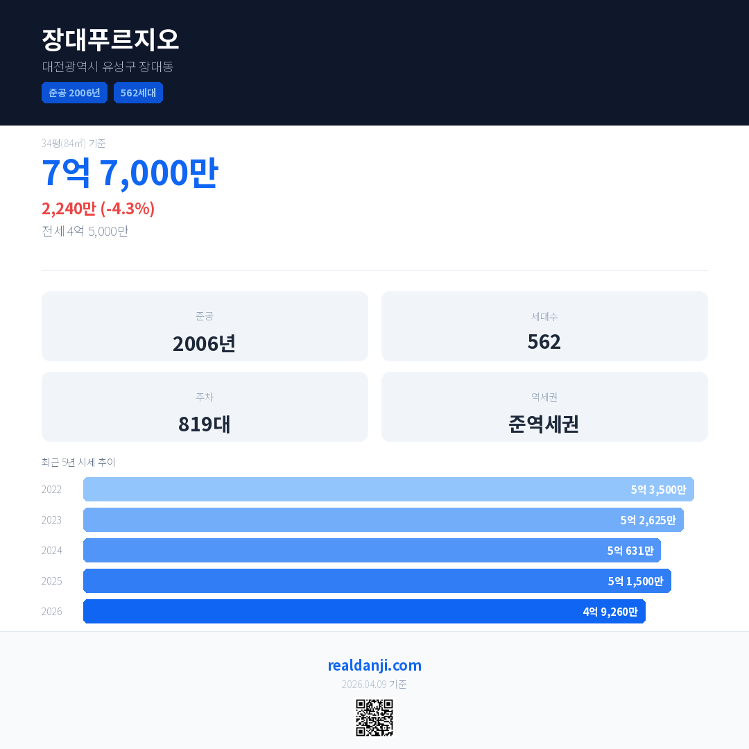 장대푸르지오 최근 거래가는 7억 7,000만입니다. (2026-03)