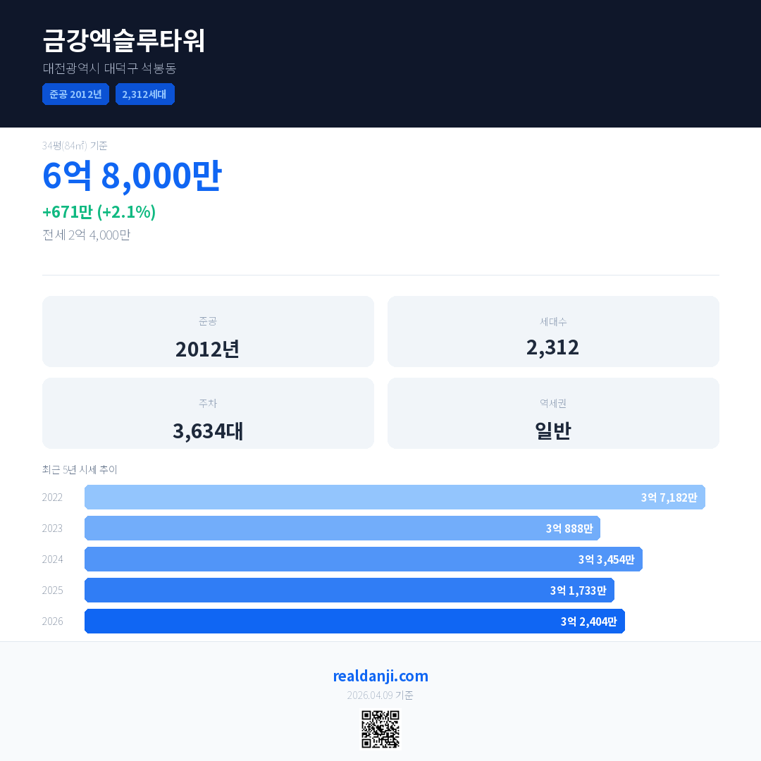 금강엑슬루타워 국민평형 기준 2026년 평균 거래가는 3억 2,404만으로, 전년 대비 2.1% 상승 했습니다.