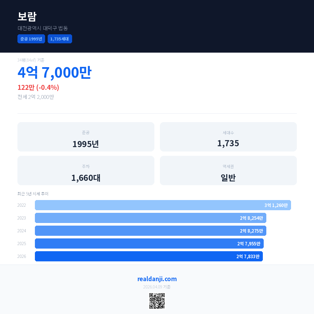 보람 국민평형 기준 2026년 평균 거래가는 2억 7,833만으로, 전년 대비 0.4% 하락 했습니다.