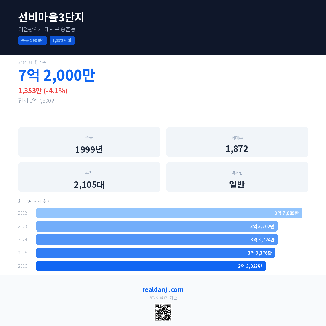 선비마을3단지 국민평형 기준 2026년 평균 거래가는 3억 2,023만으로, 전년 대비 4.1% 하락 했습니다.