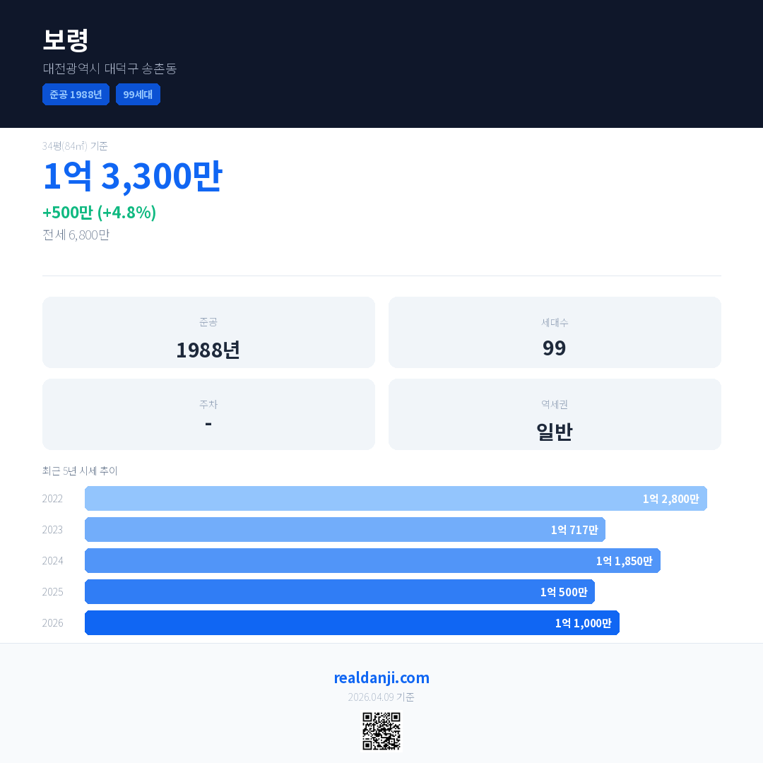 보령 최근 거래가는 1억 3,300만입니다. (2026-04)