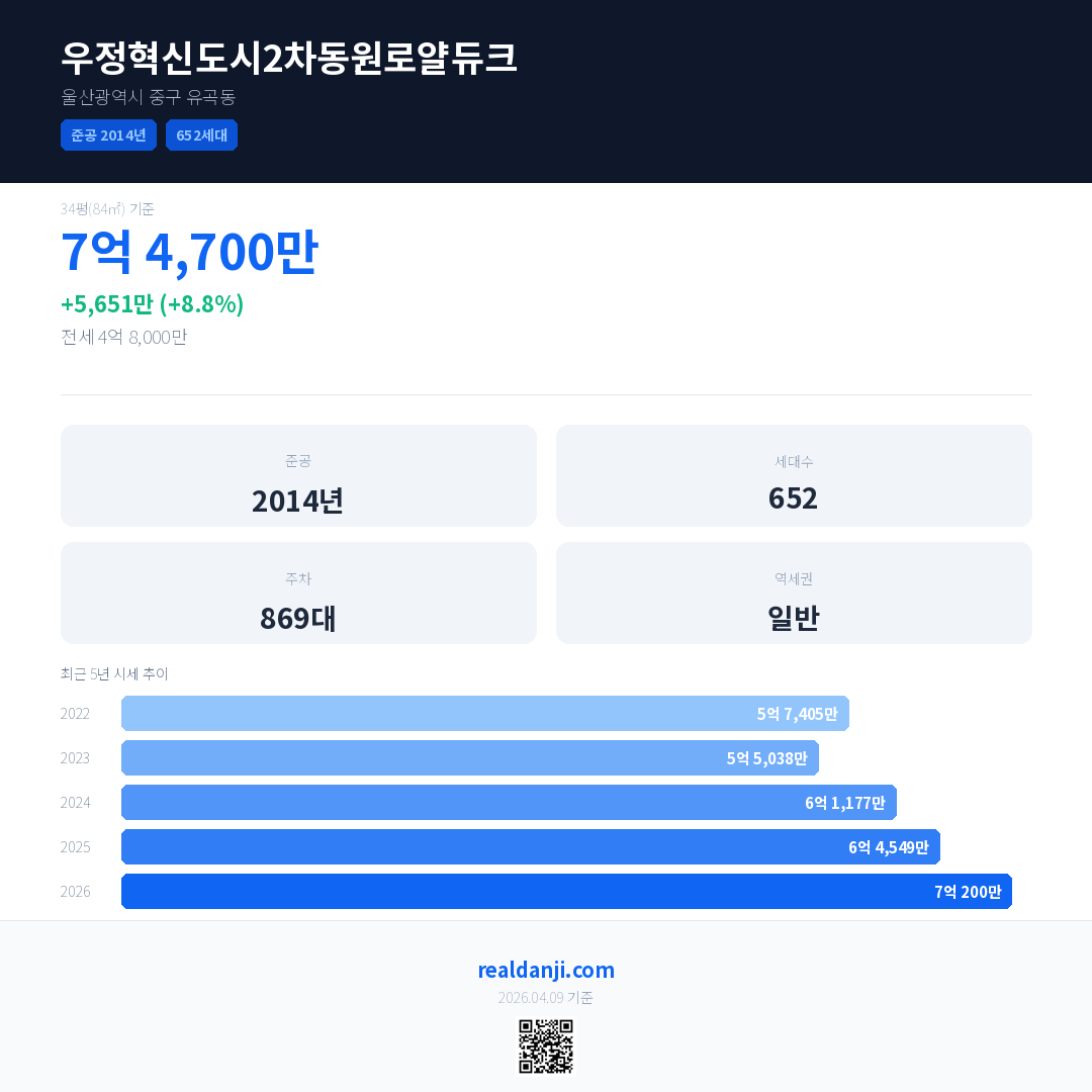 우정혁신도시2차동원로얄듀크 최근 거래가는 7억 500만입니다. (2026-03)