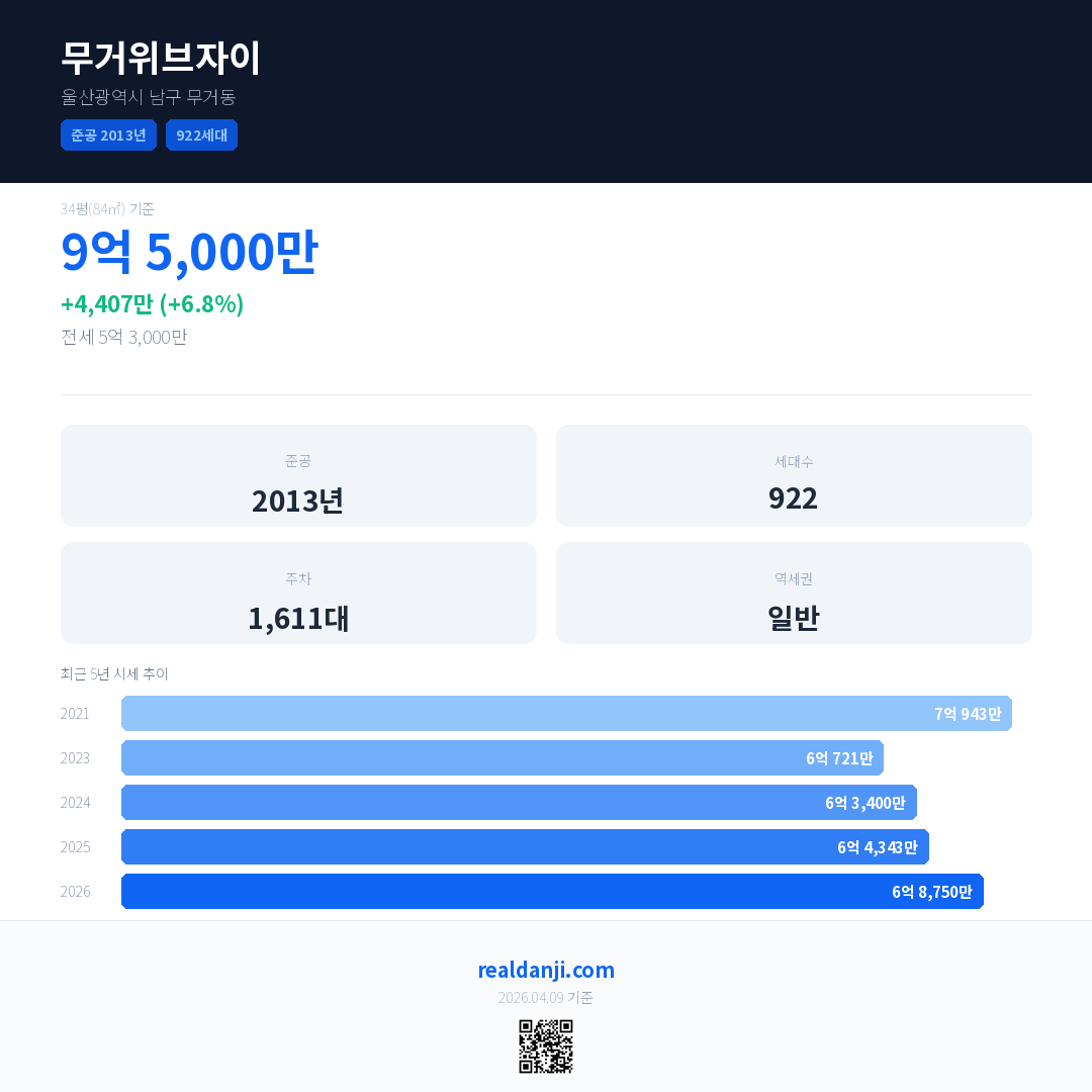무거위브자이 최근 거래가는 9억 5,000만입니다. (2026-04)