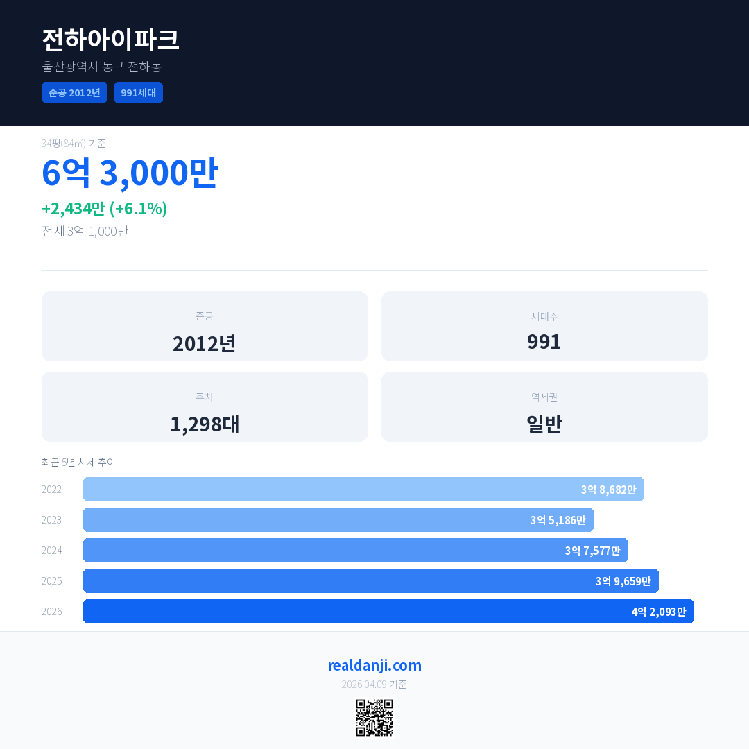 전하아이파크 국민평형 기준 2026년 평균 거래가는 4억 2,093만으로, 전년 대비 6.1% 상승 했습니다.