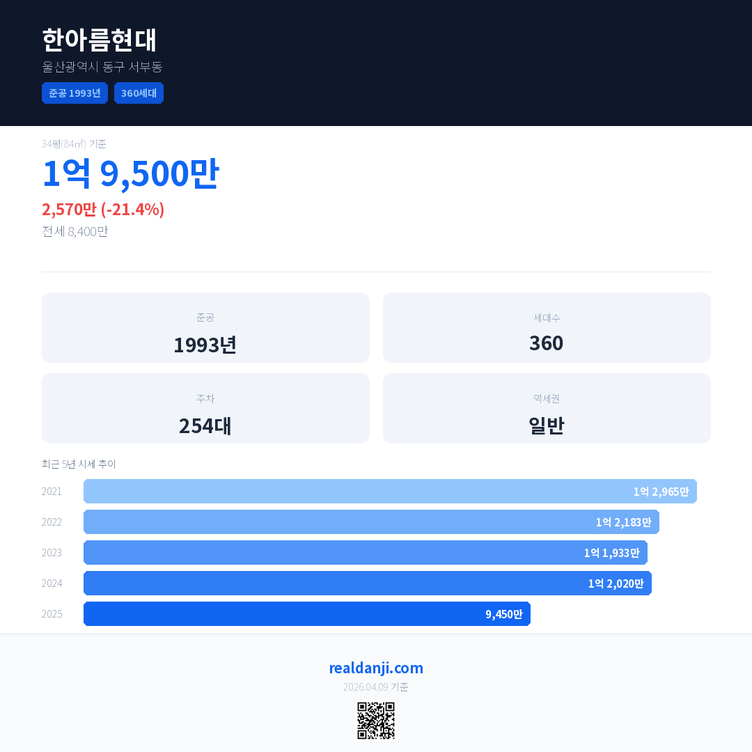 한아름현대 국민평형 기준 2025년 평균 거래가는 9,450만으로, 전년 대비 21.4% 하락 했습니다.