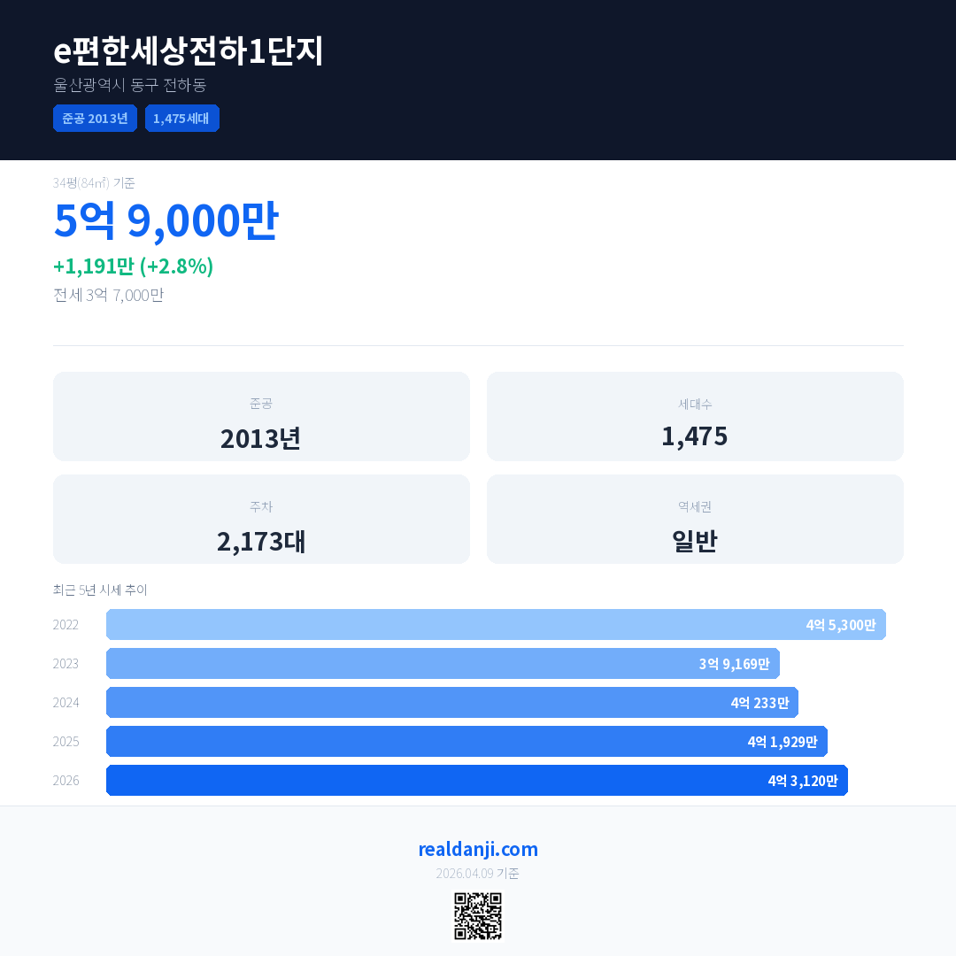 e편한세상전하1단지 국민평형 기준 2026년 평균 거래가는 4억 3,120만으로, 전년 대비 2.8% 상승 했습니다.