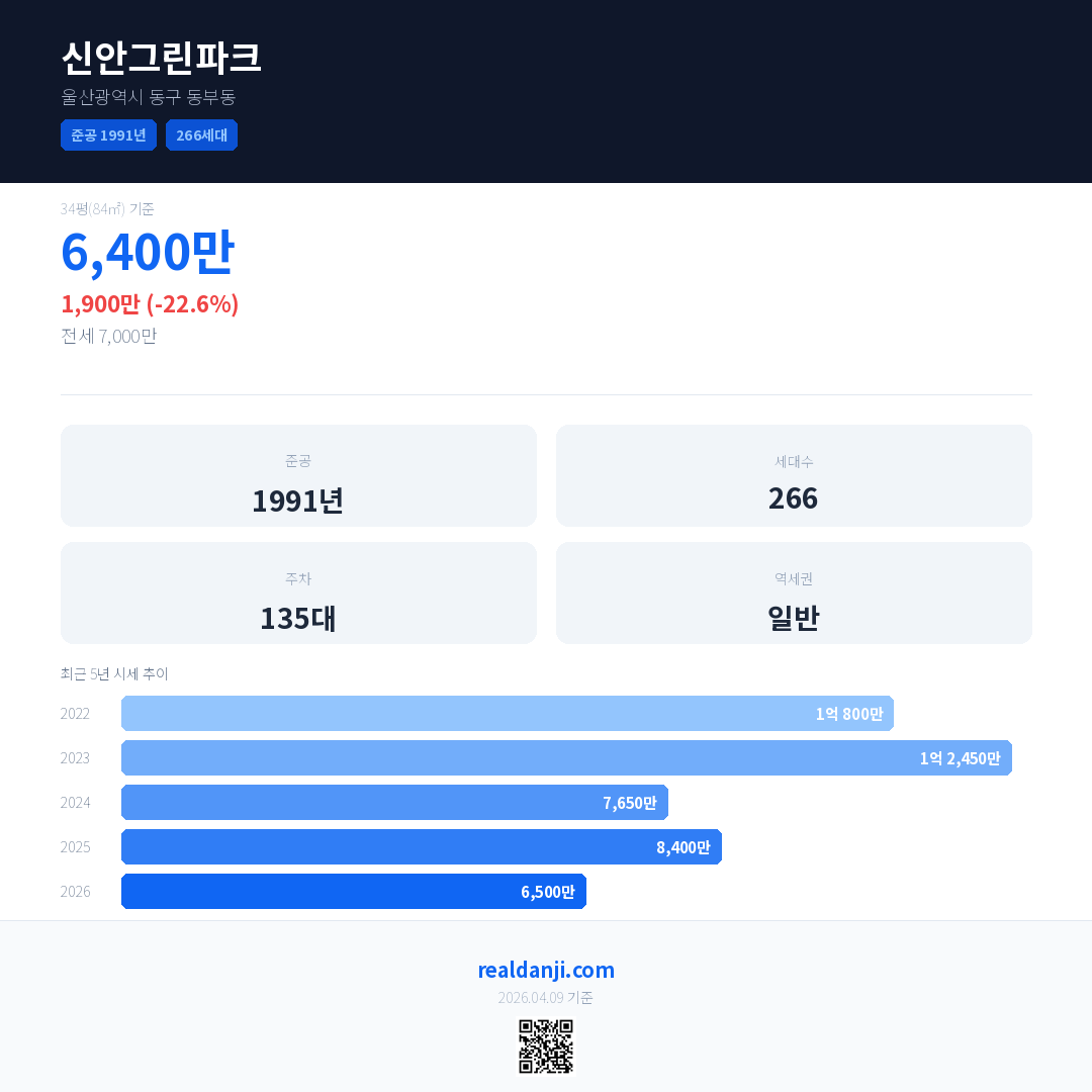 신안그린파크 국민평형 기준 2026년 평균 거래가는 6,500만으로, 전년 대비 22.6% 하락 했습니다.