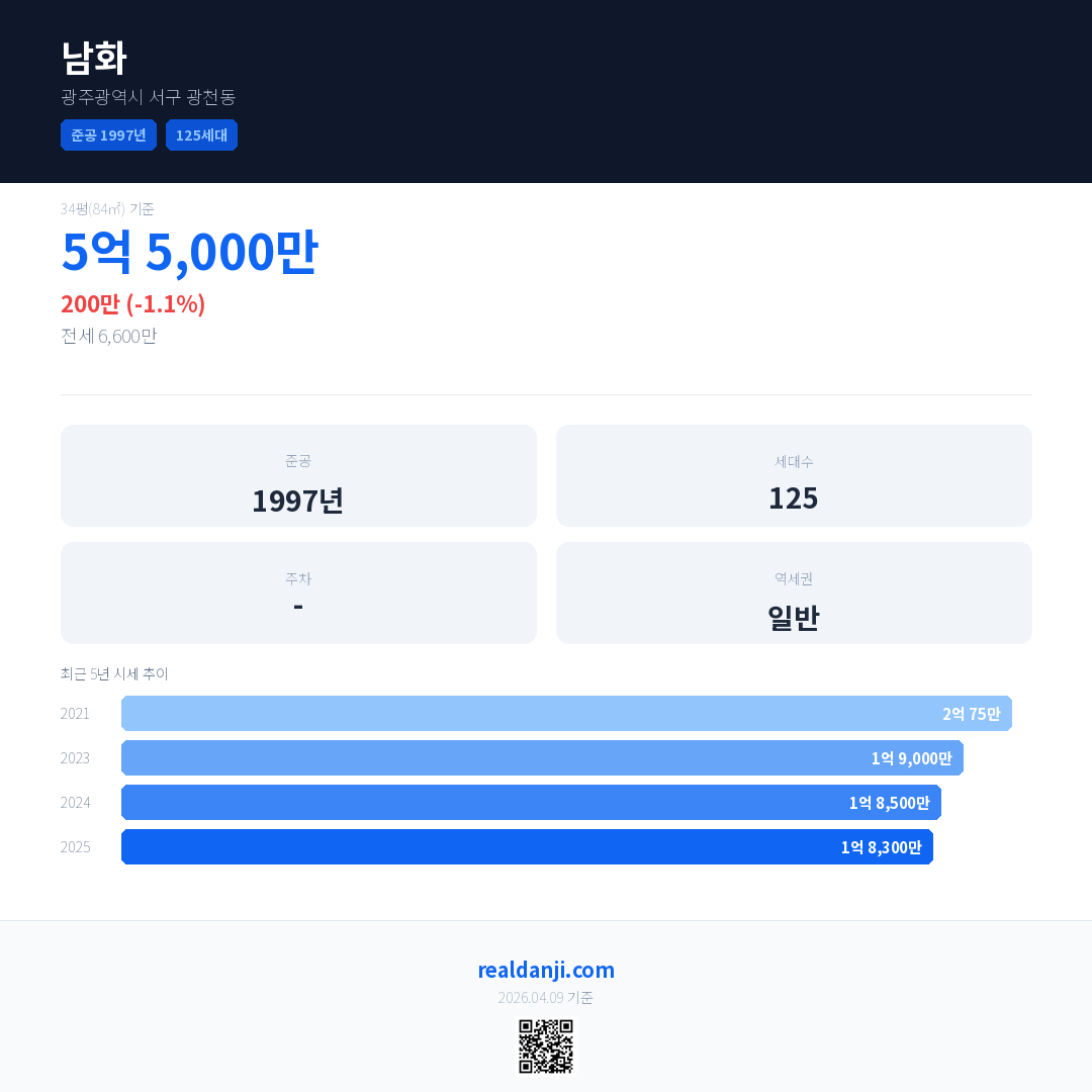 남화 국민평형 기준 2025년 평균 거래가는 1억 8,300만으로, 전년 대비 1.1% 하락 했습니다.