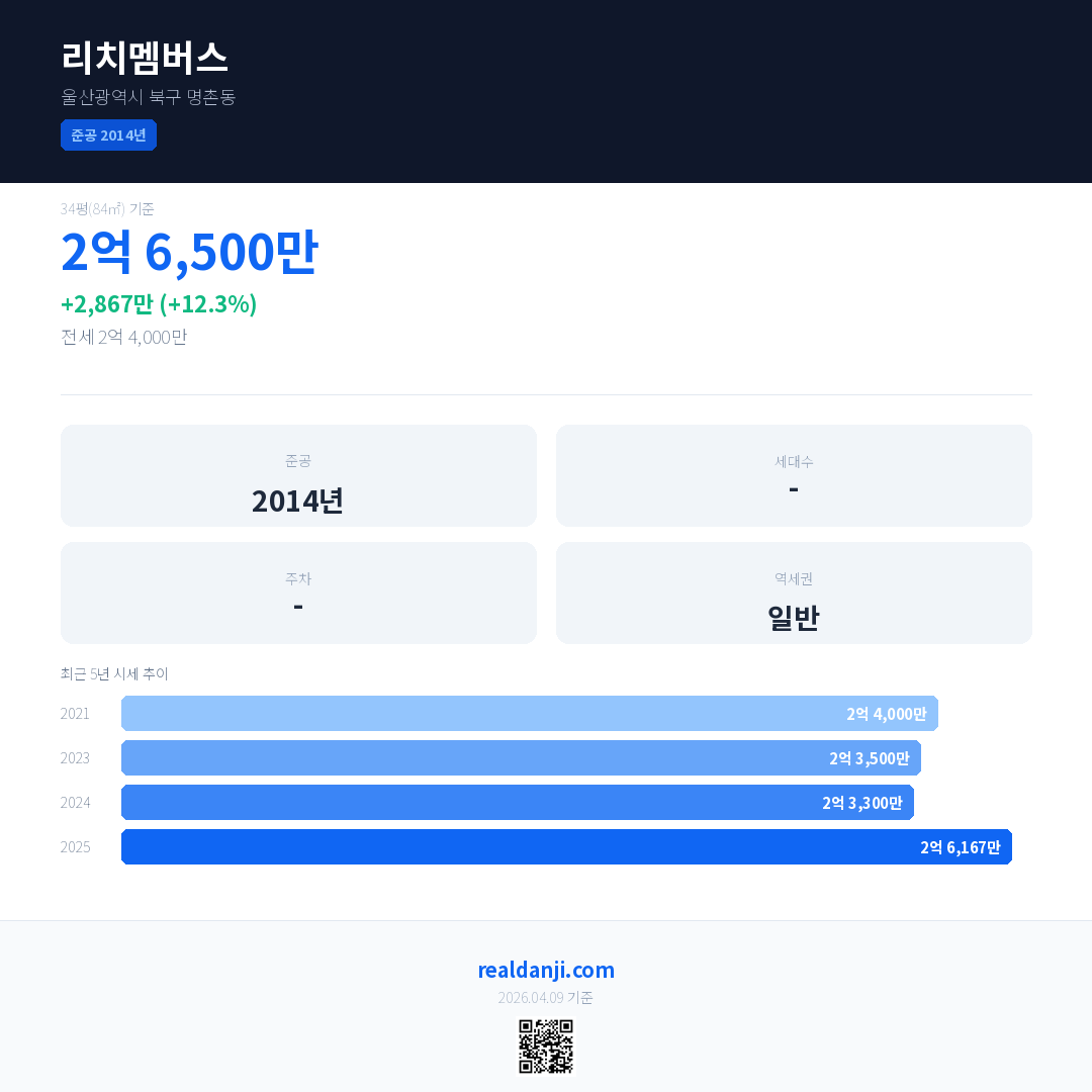 리치멤버스 국민평형 기준 2025년 평균 거래가는 2억 6,167만으로, 전년 대비 12.3% 상승 했습니다.