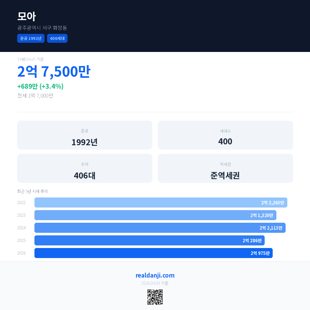 모아 국민평형 기준 2026년 평균 거래가는 2억 975만으로, 전년 대비 3.4% 상승 했습니다.