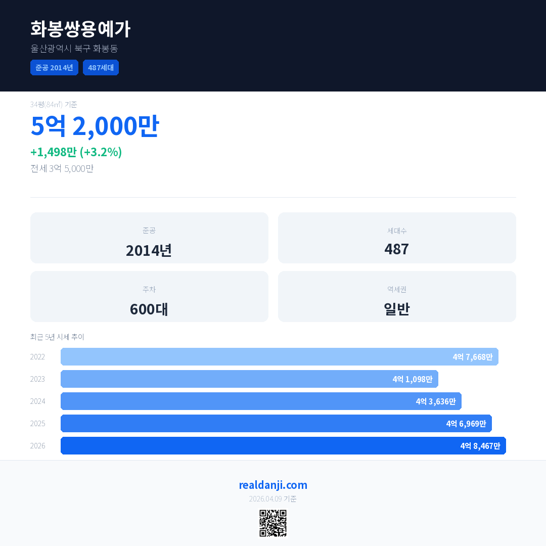 화봉쌍용예가 국민평형 기준 2026년 평균 거래가는 4억 8,467만으로, 전년 대비 3.2% 상승 했습니다.