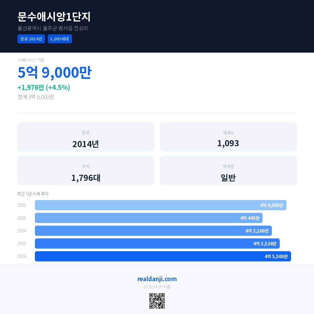 문수애시앙1단지 국민평형 기준 2026년 평균 거래가는 4억 5,500만으로, 전년 대비 4.5% 상승 했습니다.