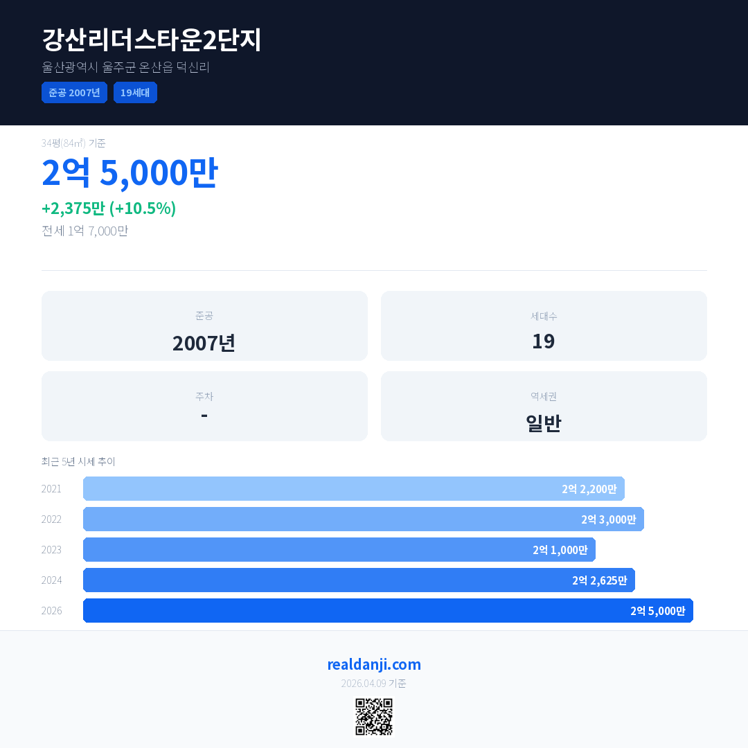 강산리더스타운2단지 국민평형 기준 2026년 평균 거래가는 2억 5,000만으로, 전년 대비 10.5% 상승 했습니다.