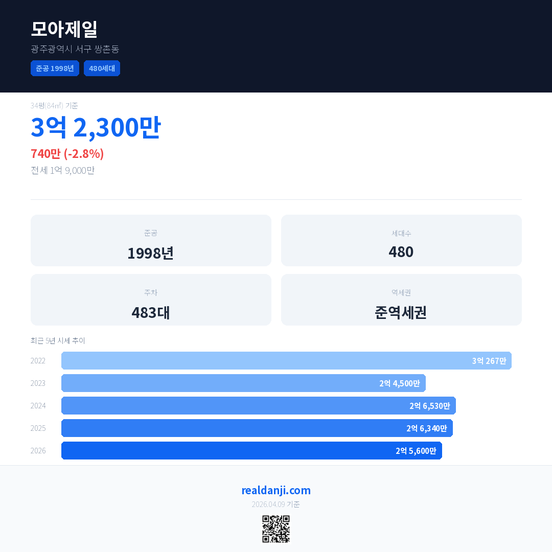 모아제일 국민평형 기준 2026년 평균 거래가는 2억 5,600만으로, 전년 대비 2.8% 하락 했습니다.
