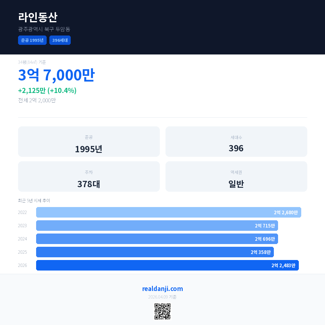 라인동산 국민평형 기준 2026년 평균 거래가는 2억 2,483만으로, 전년 대비 10.4% 상승 했습니다.