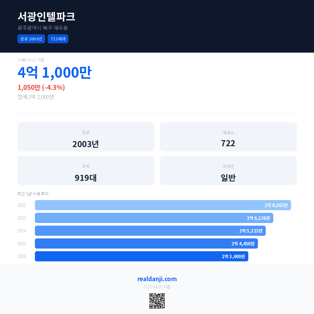 서광인텔파크 국민평형 기준 2026년 평균 거래가는 2억 3,400만으로, 전년 대비 4.3% 하락 했습니다.