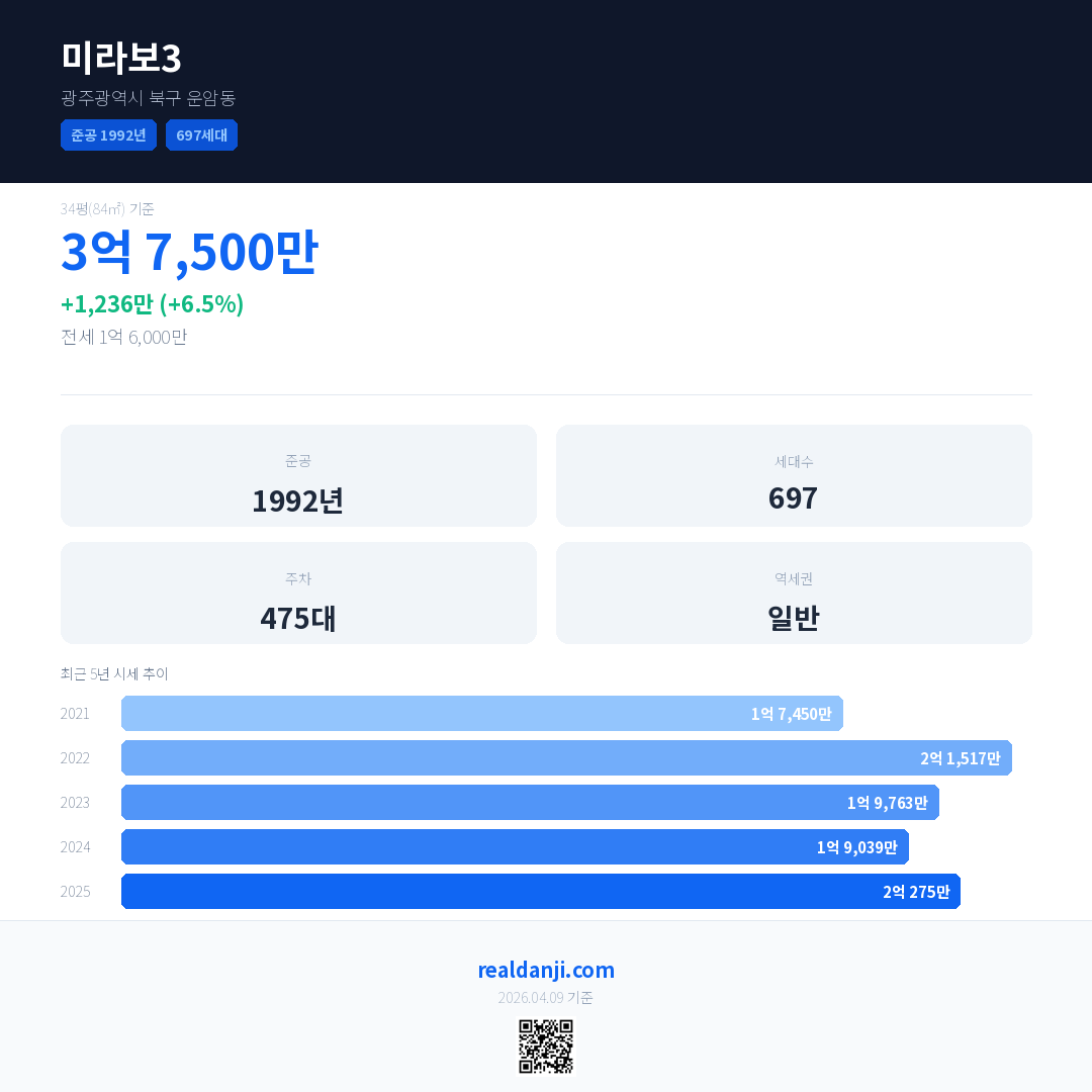 미라보3 국민평형 기준 2025년 평균 거래가는 2억 275만으로, 전년 대비 6.5% 상승 했습니다.