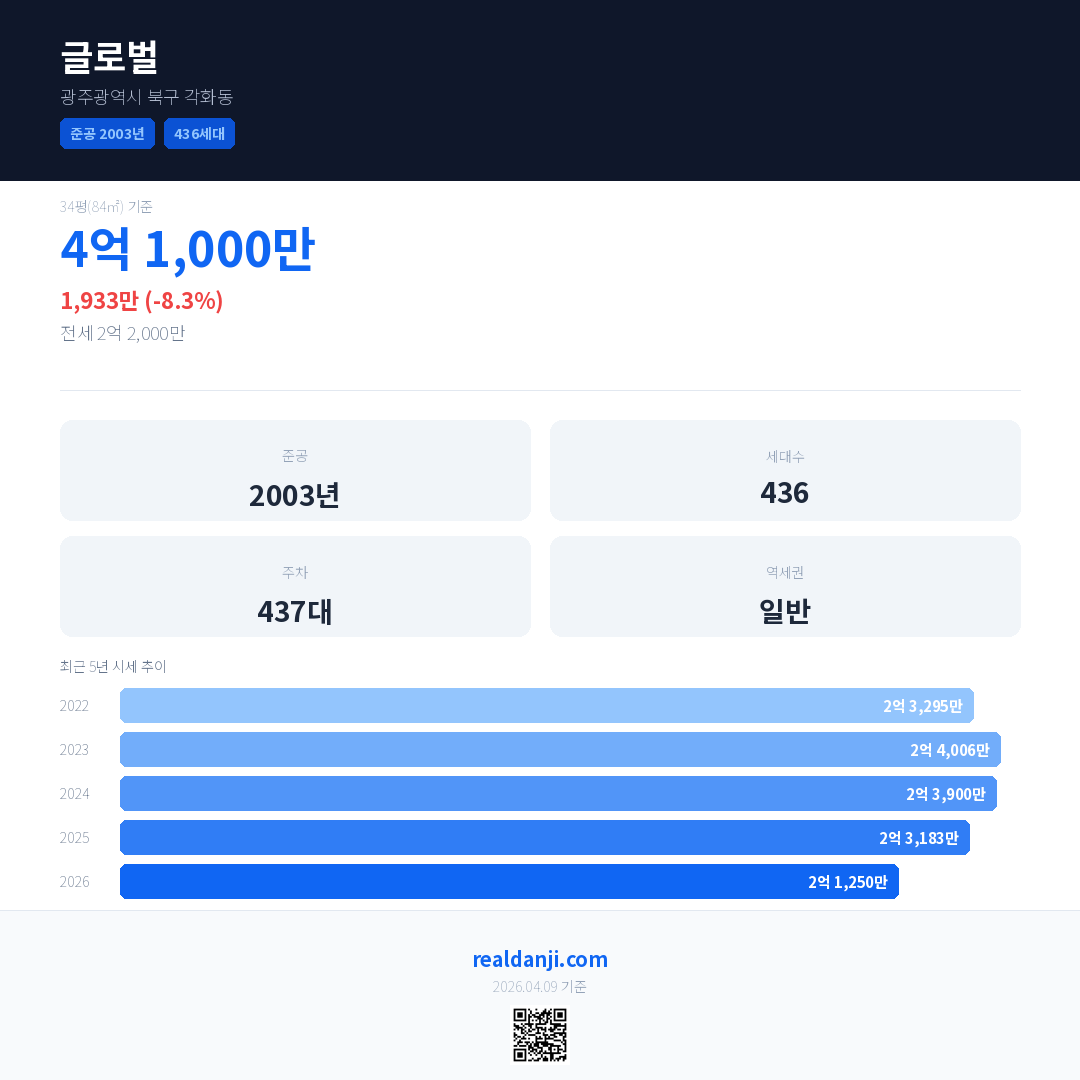 글로벌은(는) 2003년에 준공되었으며, 현재 23년차입니다. 총 436세대 규모입니다.