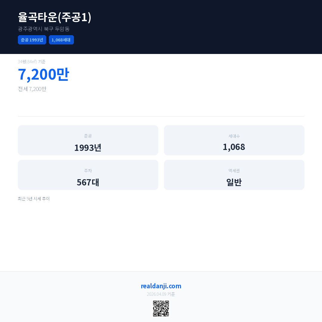 율곡타운(주공1)은(는) 1993년에 준공되었으며, 현재 33년차입니다. 총 1,068세대 규모입니다.